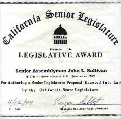 Presently, John L. is the 1998 California Senior Assemblymen of the Month, and now, the